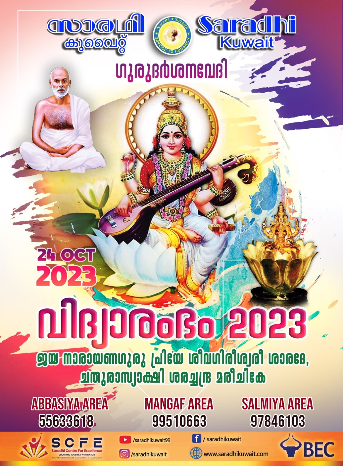 അക്ഷരങ്ങളുടെ പുതു ലോകത്തേയ്ക്ക് കാലെടുത്തുവയ്ക്കുന്ന കുരുന്നുകൾക്കായി സാരഥി കുവൈറ്റ് ഗുരുദർശനവേദി ഒരുക്കുന്ന “വിദ്യാരംഭം” ചടങ്ങുകൾ കുവൈറ്റിലെ അബ്ബാസിയ, മംഗഫ്, സാൽമിയ എന്നീ മൂന്ന് മേഖലകളിൽ 2023 ഒക്‌ടോബർ 24 ചൊവ്വാഴ്ച രാവിലെ 4.30 AM മുതൽ പ്രാർത്ഥനാ ചടങ്ങുകളോടെ പ്രഗത്ഭരായ അദ്ധ്യാപകരുടെ നേതൃത്വത്തിൽ നടത്തപ്പെടുന്നു.