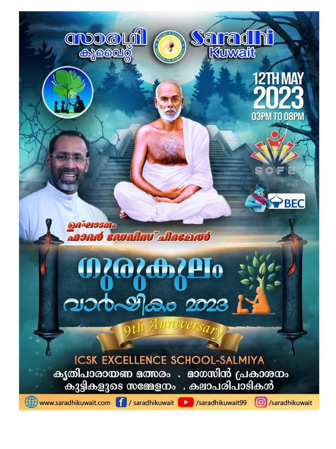 Saradhi Kuwait Held Gurukulam Annuual Function at Samiya Excellence School on May 12, 2023. Fr. Davis Chiramel inaugurated the function.The event was attended by several dignitaries, including the Saradhi President K R Aji, General Secretary Jayan Sadasivan ,Malayalam Mission Kuwait President ——–, Vanitha Vedhi Chairperson Preethi Prasanth, and Treasurer Dinu kamal.