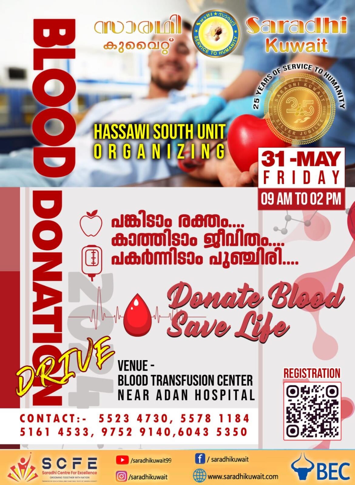 സാരഥി കുവൈറ്റ്‌ സിൽവർ ജൂബിലിയുടെ ഭാഗമായി മെയ്‌ 31 വെള്ളിയാഴ്ച രാവിലെ 9 മണി മുതൽ ഉച്ചക്കു 2 മണി വരെ അദാൻ സെൻട്രൽ ബ്ലഡ് ബാങ്കിൽ വച്ച് രക്തദാന ക്യാമ്പ് സംഘടിപ്പിക്കുന്നു.